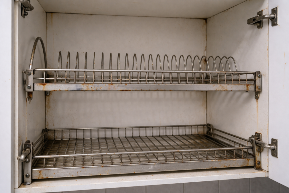 Đối với các phụ kiện như giá bát, dấu hiệu tích nước hoặc xuất hiện ẩm mốc cho thấy hệ thống thoát nước hoặc thiết kế chưa thực sự tối ưu. Nước đọng lâu ngày không chỉ gây mất vệ sinh mà còn đẩy nhanh quá trình oxy hóa và xuống cấp của vật liệu.