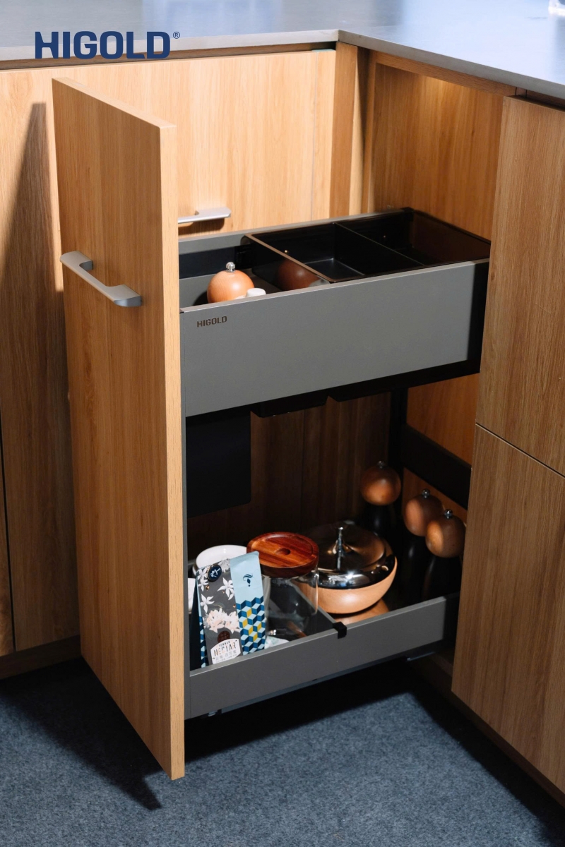 Ưu điểm lớn của hệ lưu trữ chuyên dụng là giúp tận dụng chiều sâu khoang tủ tốt hơn so với cách xếp thủ công. Đồng thời, việc kéo mở thuận tiện cũng giảm đáng kể thao tác cúi người hoặc phải lấy lần lượt từng món phía trên.