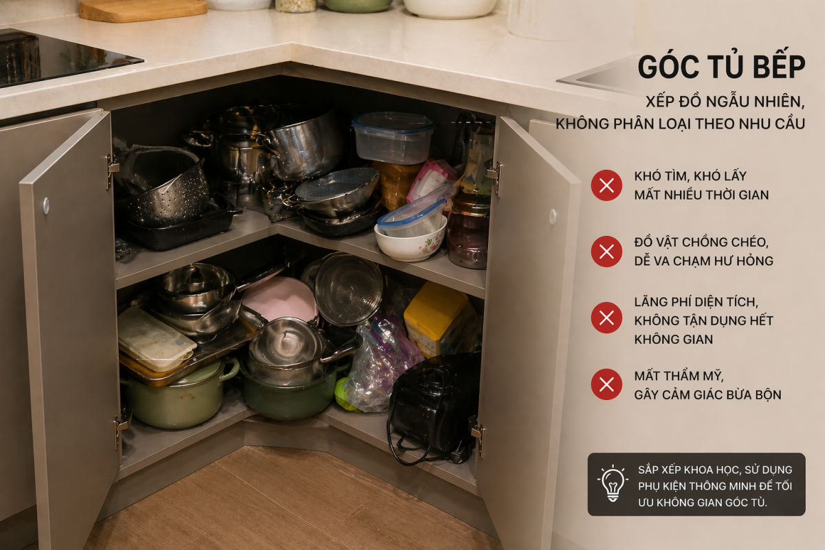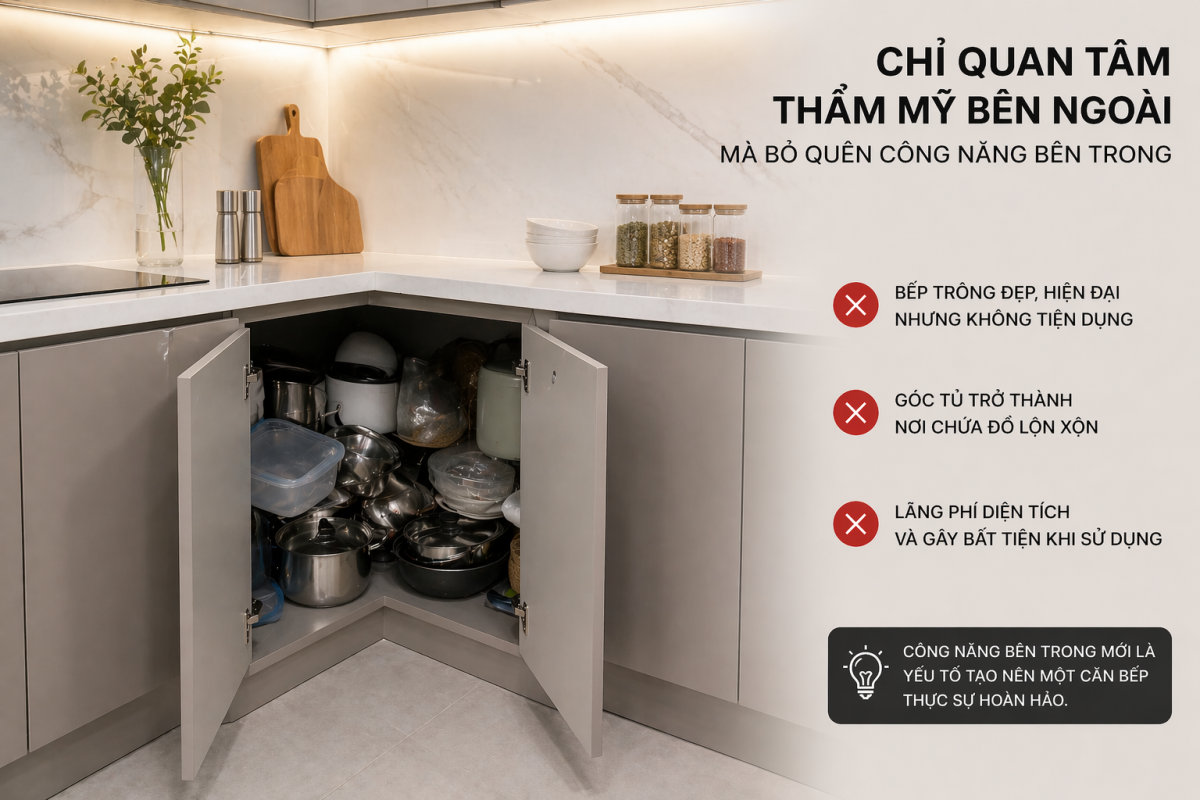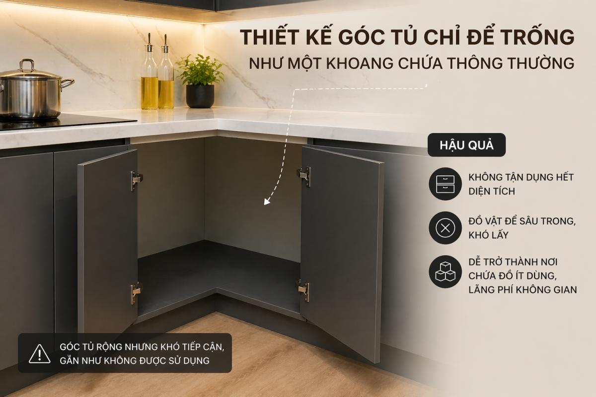 Đây là lỗi phổ biến nhất trong nhiều căn bếp. Góc tủ được đóng kín, bên trong là một khoang rỗng khá rộng nhưng không có cơ cấu hỗ trợ lấy đồ. Khi sử dụng, người dùng thường chỉ đặt một vài món ở phía ngoài, còn phần sâu bên trong gần như không được tận dụng. Sau một thời gian, khu vực này trở thành nơi cất những món ít dùng, đồ dự phòng hoặc các vật dụng bị quên lãng. Không gian có nhưng công năng gần như bằng không.