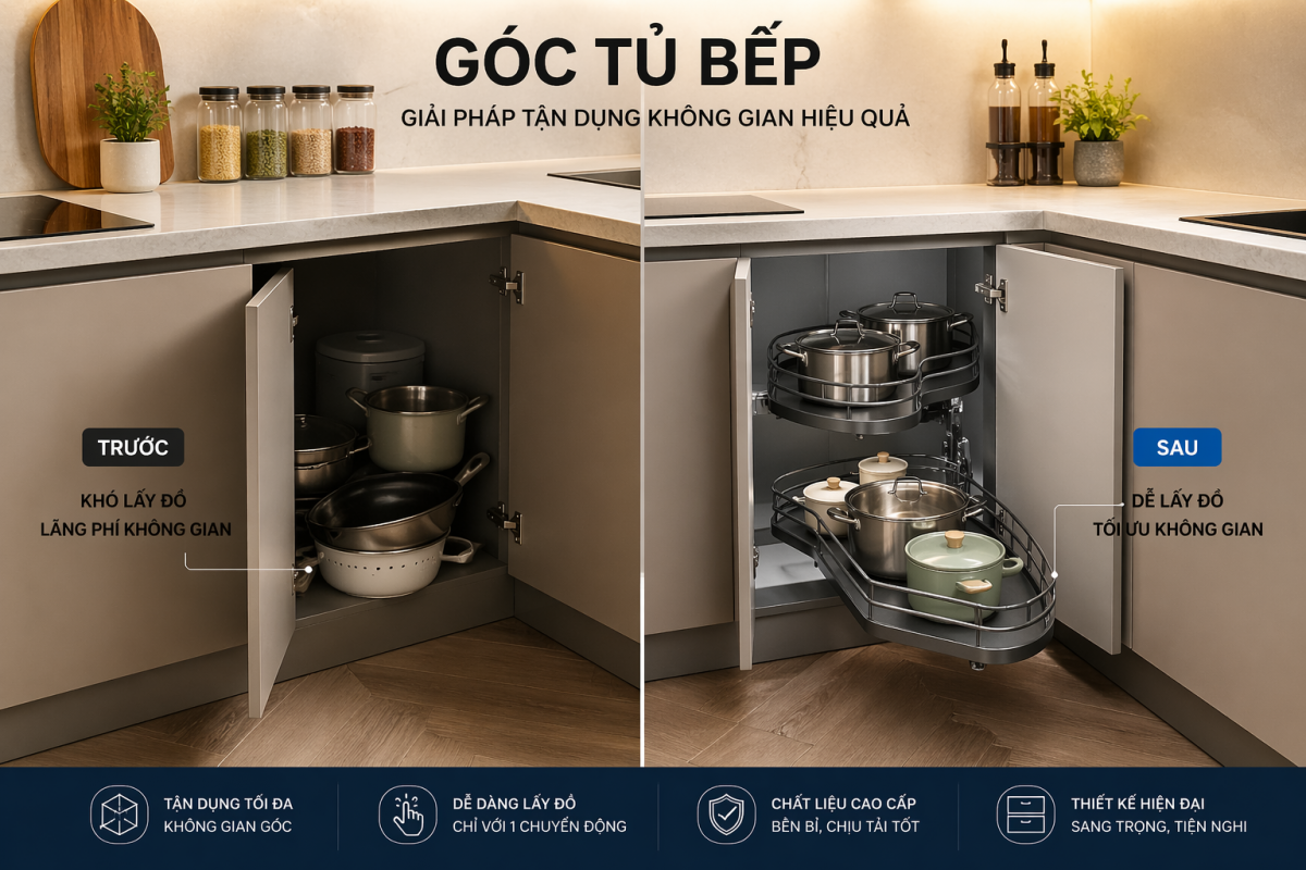 Khi được bố trí đúng cách, góc tủ có thể trở thành nơi lưu trữ giá trị nhất cho nhóm vật dụng cồng kềnh mà các khoang tủ thông thường khó đáp ứng. Ngoài ra, đây cũng là bước nâng cấp đáng cân nhắc cho những gia đình muốn cải thiện công năng bếp mà chưa cần thay mới toàn bộ hệ tủ.