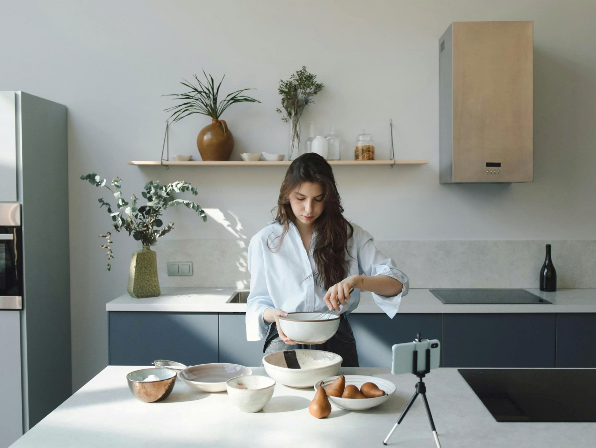 Rất nhiều người WFH thực hiện cuộc họp từ bếp. Một background gọn gàng, có tính thương hiệu cá nhân là lợi thế. Gợi ý: